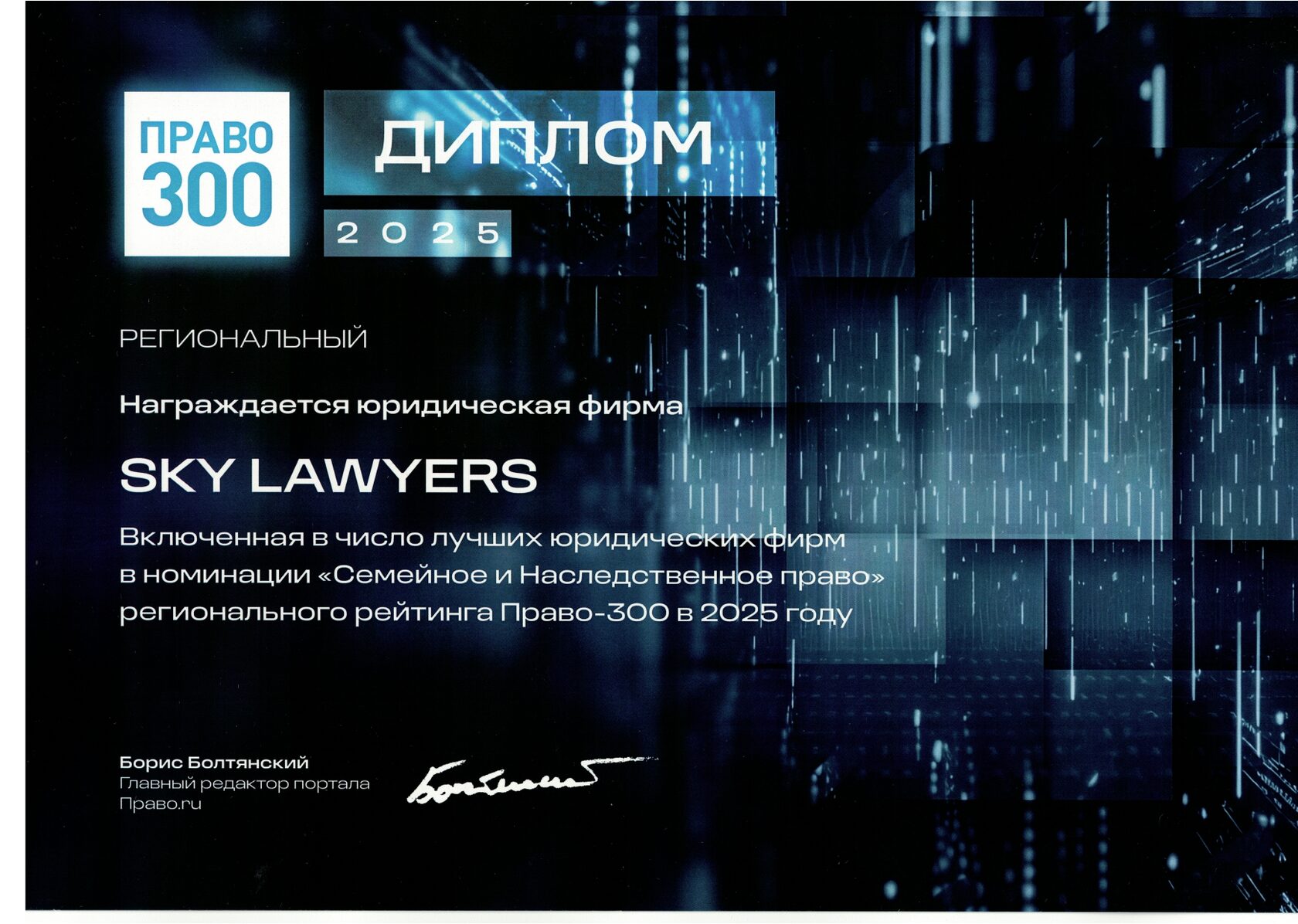 Коллегия адвокатов "Sky Lawyers" включена в число лучших юридических фирм в номинации "Семейное и Наследственное право" регионального рейтинга Право-300 в 2025 году.
